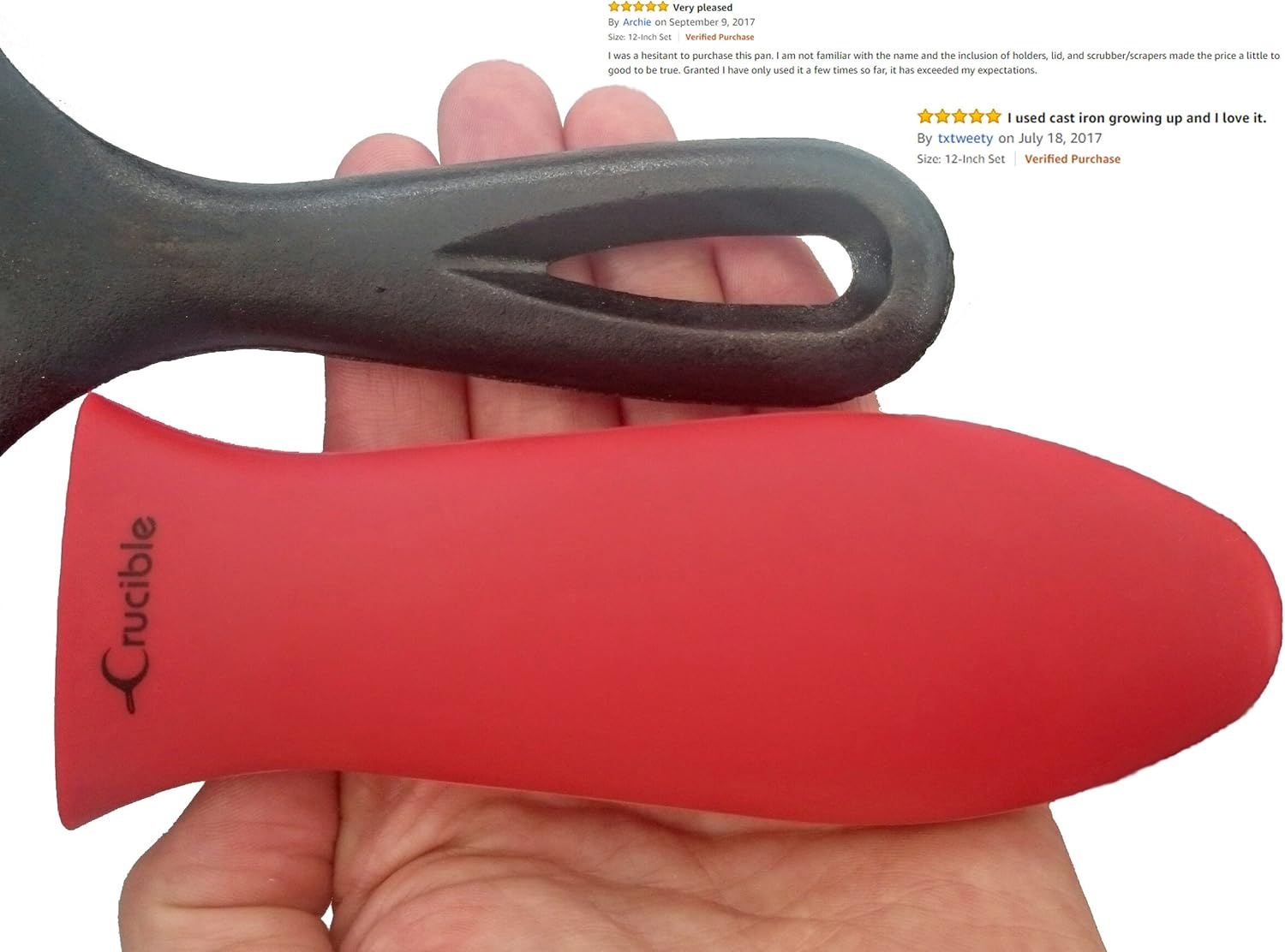 Silicone sizzling deal with holders – You possibly can have the silicone sleeve on the entire time when cooking on the range so you do not seize the forged iron by mistake.