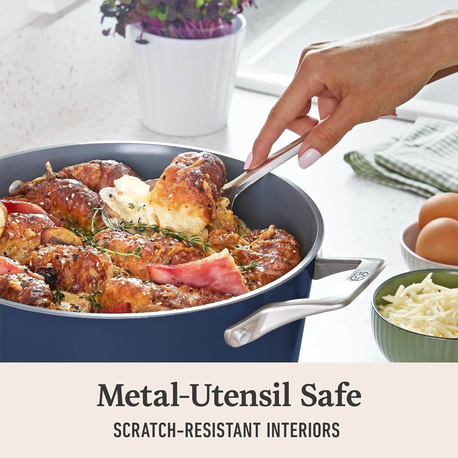 Steel Utensil-Protected: Cooking from scratch deserves scratch-free cookware, so our ceramic pans have scratch-resistant interiors.