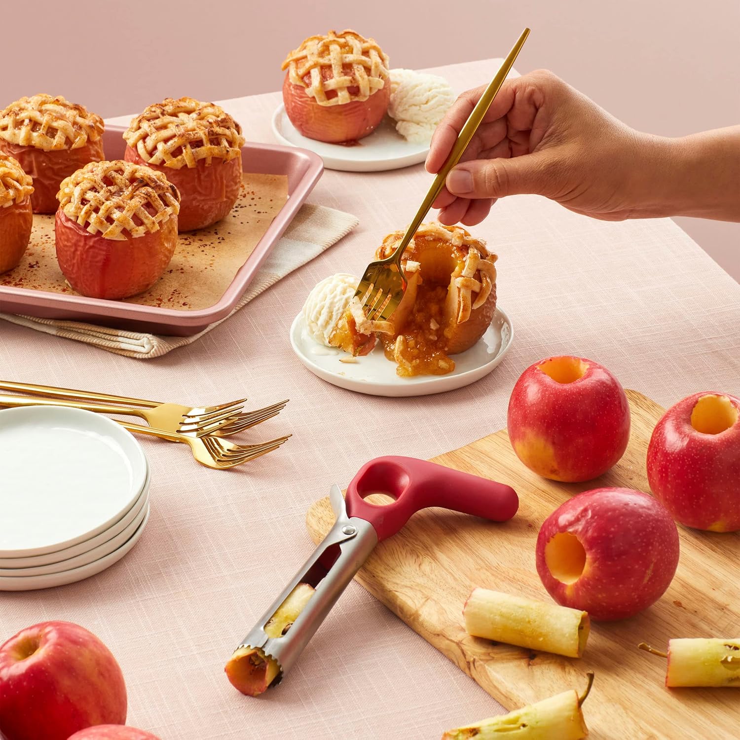 QUICK AND EFFICIENT: With a serrated edge that simply pierces and cuts by apples, a two-part coring blade, and a spring design that shortly releases apple cores, this stainless-steel corer was designed to make gentle work of apple prepping.