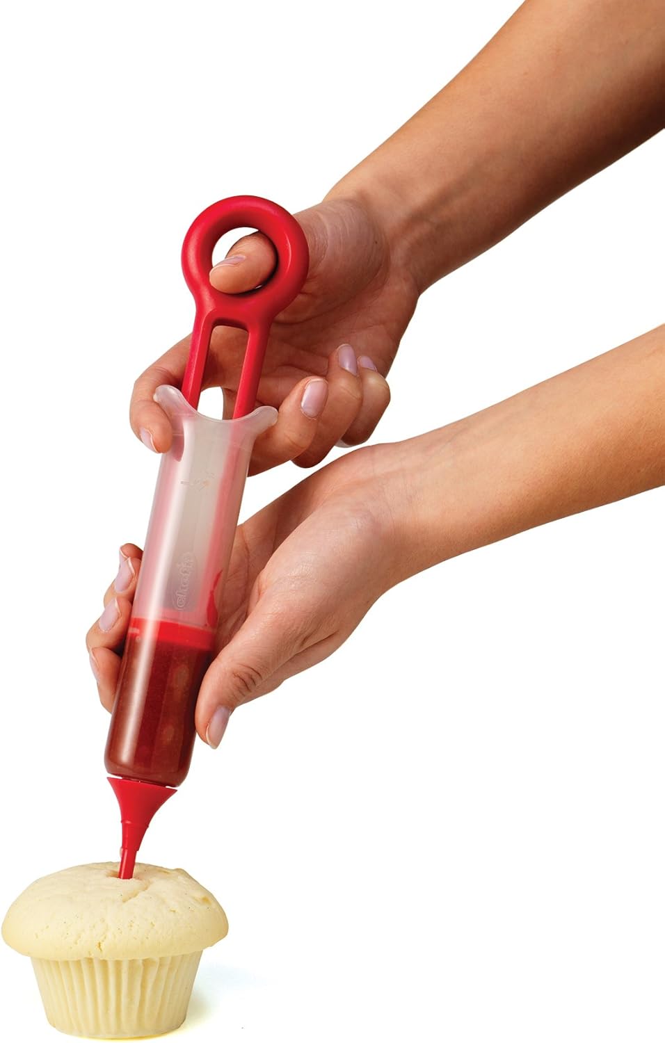 Fill cupcakes with custards, lotions, and jellies with the injector tip, exactly measure and portion cupcake batter with the batter tip, and twist on the decorator tip to frost starbursts, edges, flowers and extra.