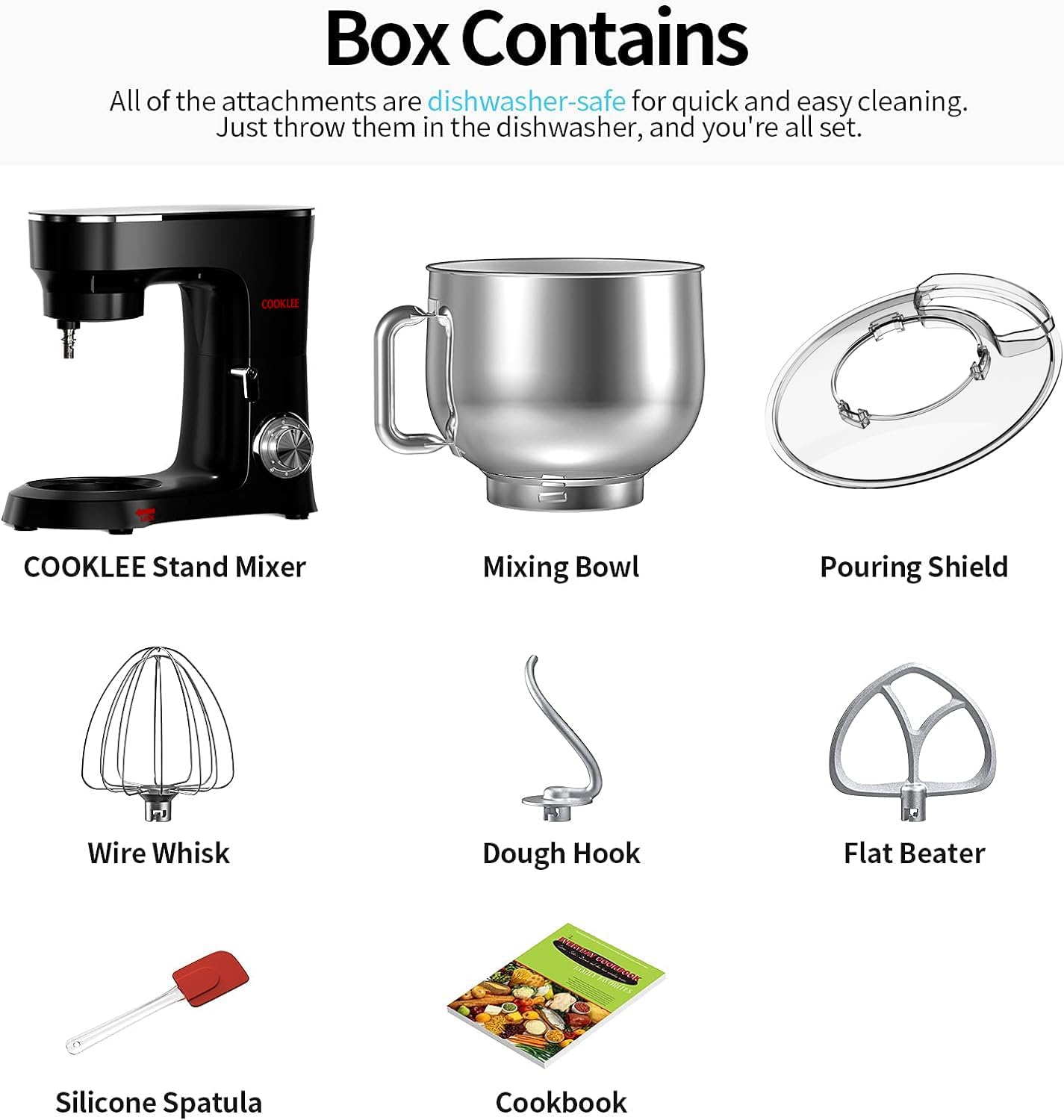 9.5-QUART HIGH CAPACITY – Massive stainless-steel mixing bowl gives sufficient capability. Every COOKLEE kitchen Electrical mixer comes with a dough hook, flat beater, wire whip, and pouring protect avoiding mess kneading course of