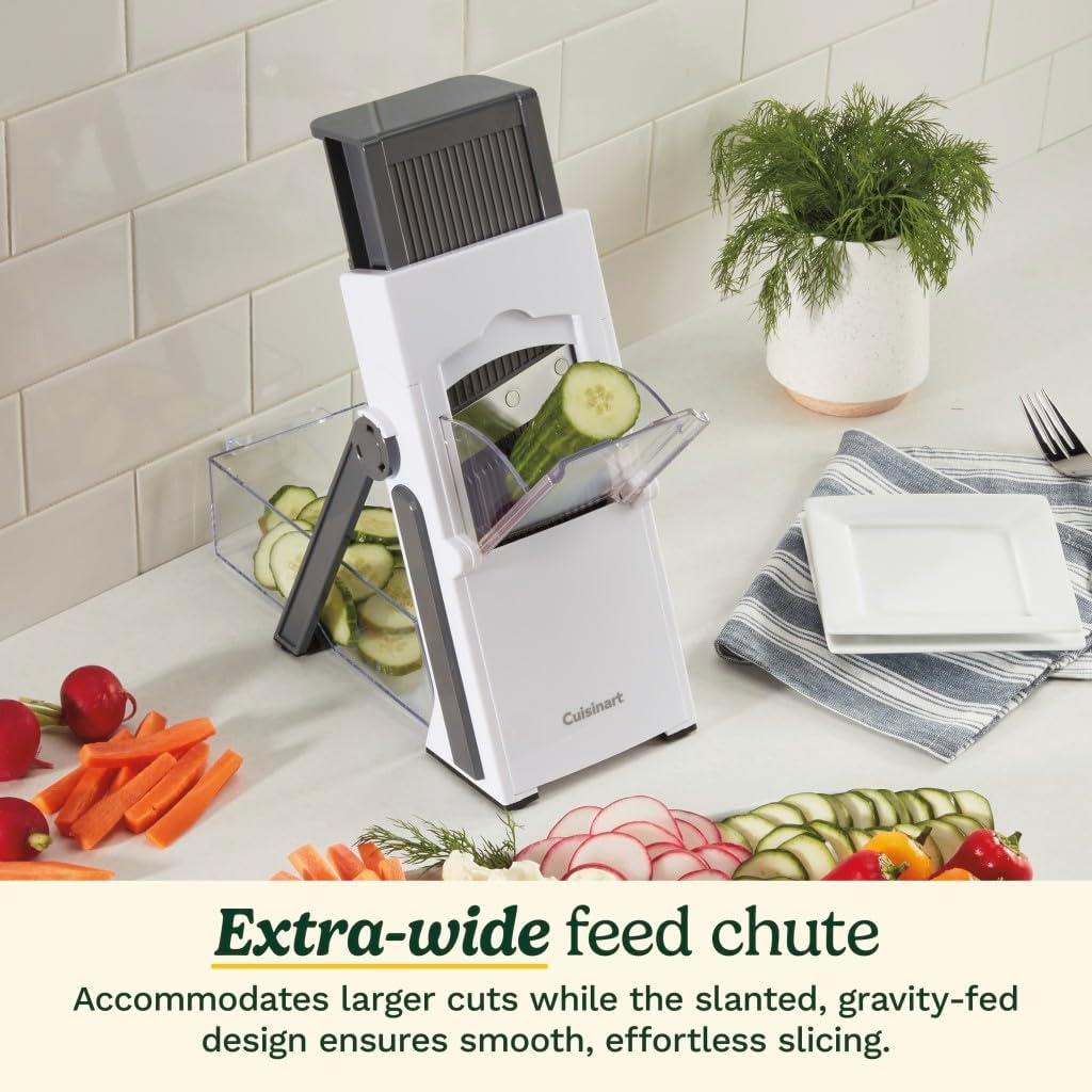 The Cuisinart PrecisionSlice™ Upright Mandoline combines ease and flexibility with an upright design that ensures arms are refrained from the blades. Geared up with Cuisinart’s unique meals processor blade know-how, this modern kitchen important transforms vegatables and fruits into completely uniform slices, dices and skinny and thick julienne strips. Alter the sliders to alter between reducing choices and easily flip the management knob for 40 adjustable thickness choices, from 1 mm to eight mm. The additional-wide feed tube simply accommodates bigger cuts of meals to reduce trimming, and the slanted, gravity-fed design ensures clean, easy slicing. Compact and foldable, with a customized attachable assortment container and cleansing brush, this mandoline set is constructed for handy self-storage.