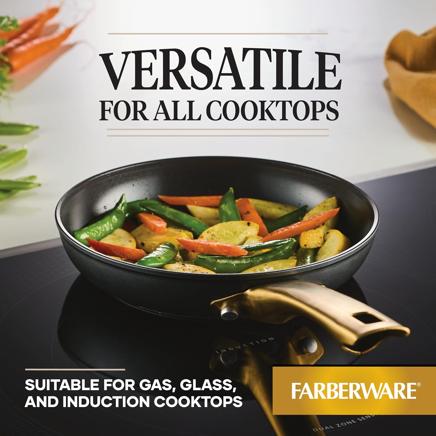 Farberware’s Cast Induction assortment combines high-performance ceramic nonstick with a lovely design that appears good on any stovetop, together with induction. Cast Induction options secure, non-toxic ceramic nonstick surfaces* so you may prepare dinner with confidence, forged-aluminum building for superior warmth distribution, and edge-to-edge metal bases for enhanced sturdiness. Plus, this 8.25-inch frying pan stands out in any kitchen or on any eating desk with a matte-black exterior and stylish gold accents. *Product design doesn’t contain deliberately including to the product any poisonous substances, together with PFAS, PFOA, PTFE, lead, or cadmium, which can in any other case be current within the surroundings.