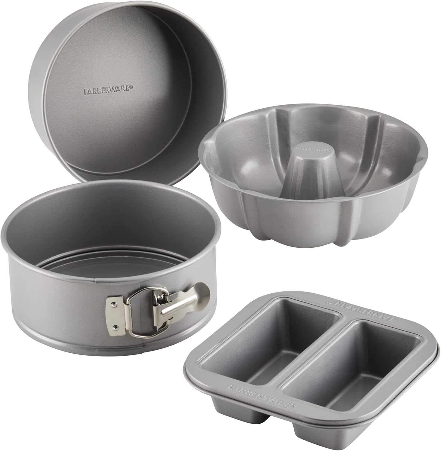 BAKEWARE SET INCLUDES: 7-inch spherical cake pan, 7-inch springform pan, 8.25-inch fluted mildew, 2-cup mini loaf pan