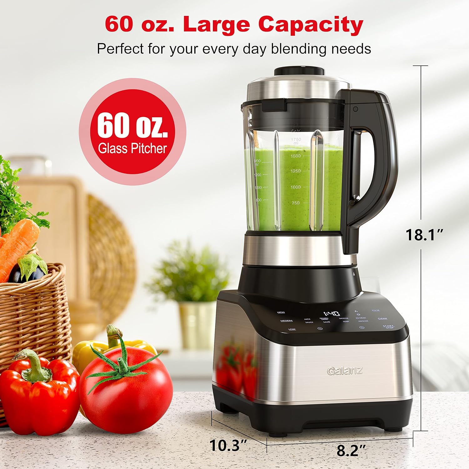 Cook dinner meals from begin to end and mix to perfection with this Galanz Excessive Velocity Digital Cooking Blender. Outfitted with a devoted heater, the multifunctional blender can be utilized for heating and mixing scorching or chilly substances. The cooking blender’s pre-programmed settings embrace Smoothie, Frozen Drinks, Ice Cream, Heating, Soup, Juice, Sauce, and Milk Shake. The versatile blender additionally provides guide settings and pulse for final management over the velocity and time. Different highlights embrace a contact management panel with a digital show, a sturdy 60-ounce glass jar with a leak proof lid and measuring cup, and a useful clear setting. Housed in chrome steel with black accents, the Galanz cooking blender provides a modern look and supreme comfort.