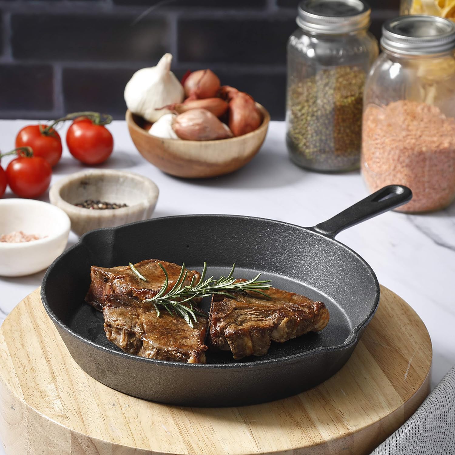 Forged iron pans are necessities in any kitchen. Sear, sauté, pan-fry, bake, broil, roast, and extra with these versatile and sturdy pans. Constituted of heavy-duty forged iron and preseasoned and able to use forged iron releases meals simply and its nonstick talents will solely enhance over time. Sturdy built-in handles and pour spouts supply comfort and safer dealing with so you should use these pans confidently to make scrumptious meals. Their thick steel building retains and distributes warmth extraordinarily properly to allow them to keep away from hotspots that burn meals and cook dinner extra effectively. They’re simple to keep up with occasional handwashing and reapplying with oil. Make this sturdy and versatile forged iron skillet part of your cooking toolbox and cook dinner completely browned scrumptious meals with ease.