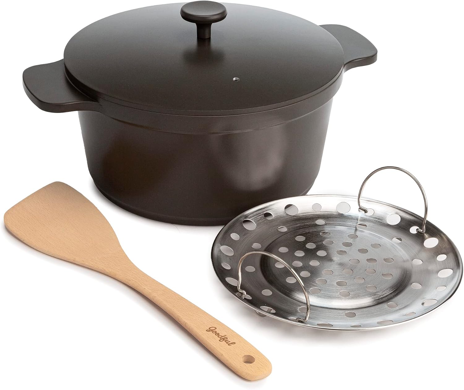 Say good day to the final pot you will ever want! The Goodful 4.7-quart All-In-One pot can substitute quite a lot of various kinds of cookware. The multi-functional pot can be utilized as a Dutch oven, inventory pot, deep fryer, sauce pot, roasting rack, steamer, braiser, saute pan and extra. Consists of lid, roasting rack and beechwood turner. The 4.7-quart design simply makes one-pan meals, sauces, entrees, and sides. It doesn’t matter what you’re cooking, this pot is at all times up for the duty. So steam, sauté, sear, boil, simmer, blanch, braise, flambe, poach, deep fry, stew after which serve in type. The solid aluminum building is heavy-duty to stop warping however gentle sufficient to maneuver round your kitchen simply. A lot lighter than a forged iron skillet, forged iron Dutch oven, or forged iron griddle. Supplies evenly distributed warmth which improves cooking high quality. Appropriate with all cooktops: electrical, gasoline, glass, or induction. Additionally, oven protected as much as 400°F. The sturdy, high-performance, long-lasting, multilayer non-stick coating permits meals to simply slide out of the pan. Additionally, this pot is made with out PFOA, lead, cadmium, poisonous metals, or nanoparticles. So lengthy elbow grease, wrinkled fingers, and rigorous scrubbing as a result of robust, stuck-on meals, the pan, roasting rack and matching lid are dishwasher protected. We do recommend hand washing the beechwood turner which retains it in tip-top form. Accessible in 7 colours to match any house or kitchen decor. Paired with the Goodful All-in-One pan, this duo can substitute a complete cookware set.