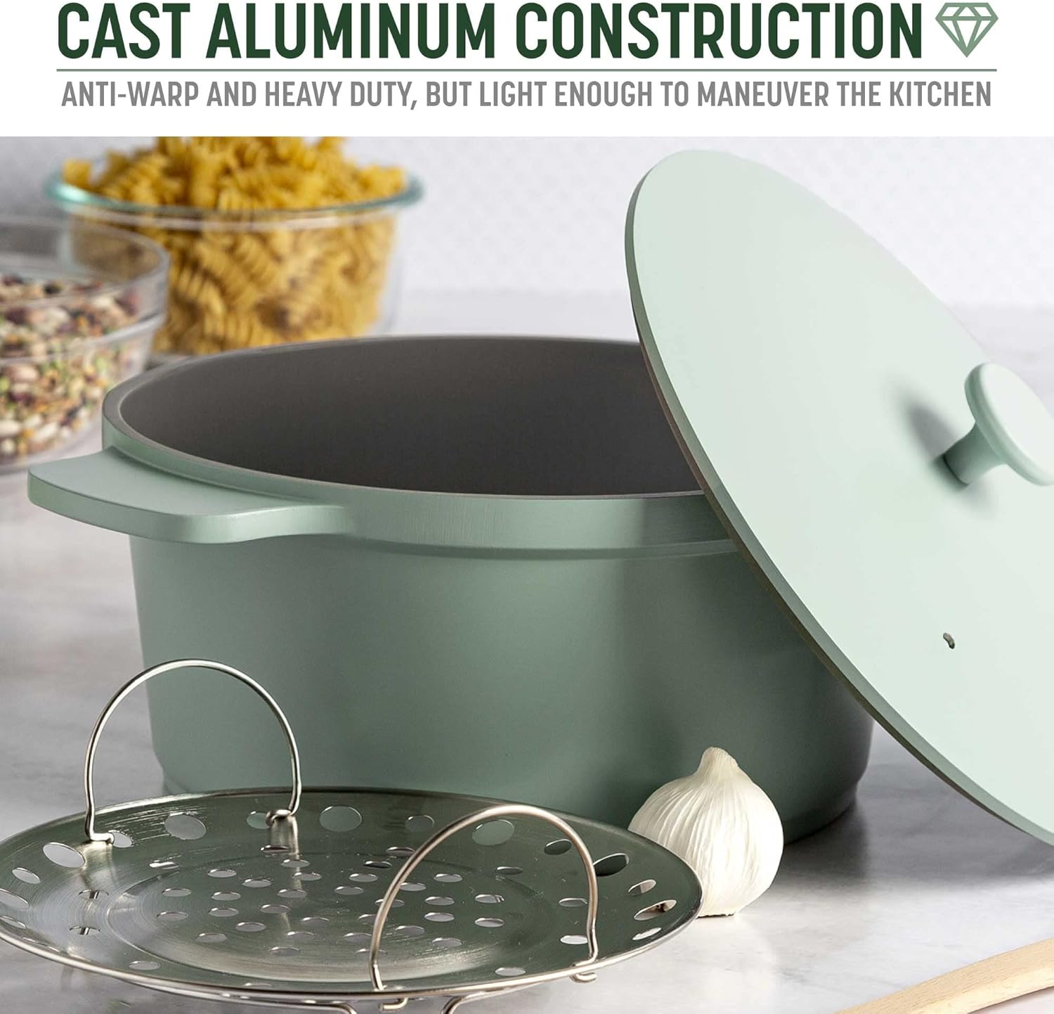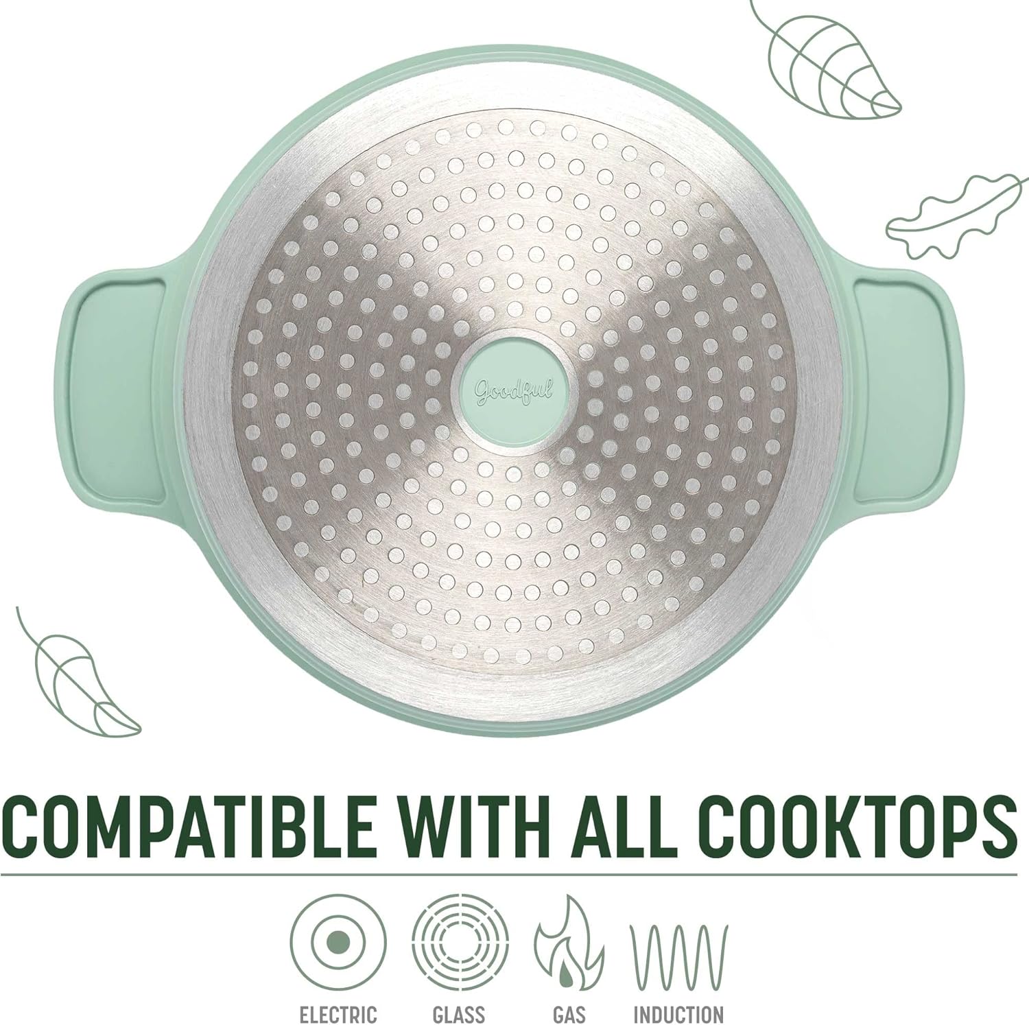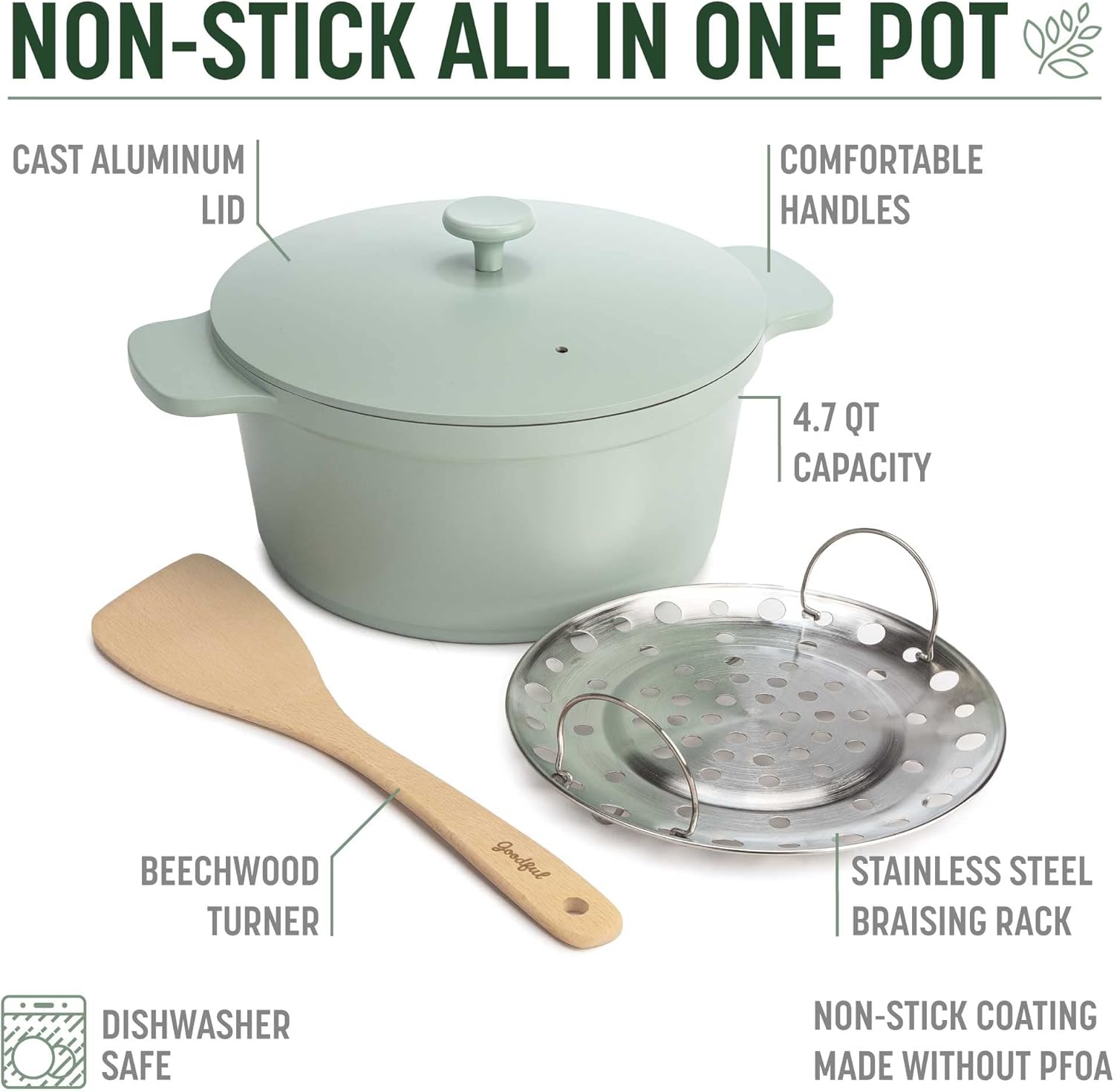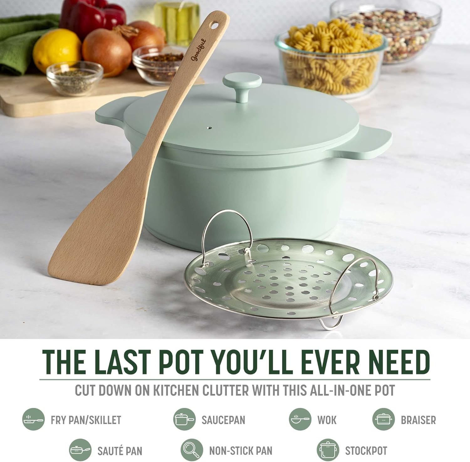 Say hey to the final pot you may ever want! The Goodful 4.7-quart All-In-One pot can change a wide range of several types of cookware. The multi-functional pot can be utilized as a Dutch oven, inventory pot, deep fryer, sauce pot, roasting rack, steamer, braiser, saute pan and extra. Contains lid, roasting rack and beechwood turner. The 4.7-quart design simply makes one-pan meals, sauces, entrees, and sides. It doesn’t matter what you’re cooking, this pot is all the time up for the duty. So steam, sauté, sear, boil, simmer, blanch, braise, flambe, poach, deep fry, stew after which serve in model. The solid aluminum development is heavy-duty to forestall warping however mild sufficient to maneuver round your kitchen simply. A lot lighter than a forged iron skillet, forged iron Dutch oven, or forged iron griddle. Supplies evenly distributed warmth which improves cooking high quality. Suitable with all cooktops: electrical, gasoline, glass, or induction. Additionally, oven secure as much as 400°F. The sturdy, high-performance, long-lasting, multilayer non-stick coating permits meals to simply slide out of the pan. Additionally, this pot is made with out PFOA, lead, cadmium, poisonous metals, or nanoparticles. So lengthy elbow grease, wrinkled fingers, and rigorous scrubbing on account of powerful, stuck-on meals, the pan, roasting rack and matching lid are dishwasher secure. We do counsel hand washing the beechwood turner which retains it in tip-top form. Obtainable in 7 colours to match any dwelling or kitchen decor. Paired with the Goodful All-in-One pan, this duo can change a complete cookware set.