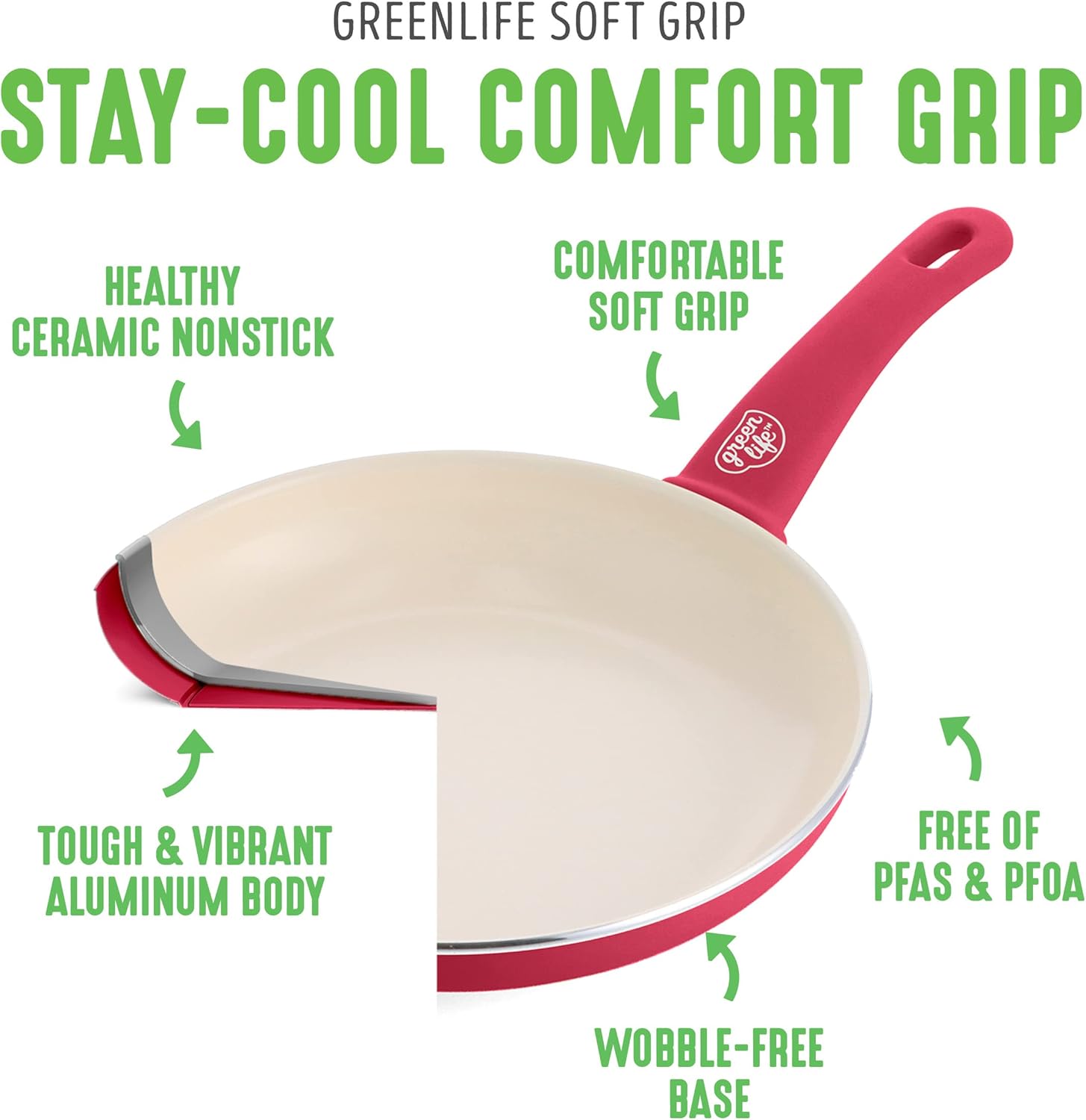 The Mushy Grip assortment is all about consolation and management. Designed for easy efficiency and cleanup, this set options our toxin-free Thermolon nonstick coating, which is freed from PFAS, PFOA, lead, and cadmium. GreenLife’s wholesome ceramic nonstick just isn’t caught previously—that’s why our ceramic nonstick begins with sand and creates 60% much less CO2 emissions in the course of the curing part than conventional coatings. The pans are additionally crafted with recycled aluminum, as a result of we wish your children’s children to prepare dinner wholesome, too. Completed in vibrant colours, this set is outfitted with stay-cool handles to maintain your cooking snug. Sturdy glass lids for a superb have a look at any meal in progress with out sacrificing warmth. For all stovetops, besides induction. Oven secure to 350°F. Dishwasher secure. This cookware set contains: 4-inch mini frypan, 7-inch and 9.5-inch open frypans, 1-quart and 2-quart coated sauce pans, 5-quart coated stockpot, 2.5-quart coated sauté pan, stainless-steel steamer, and 4 kitchen utensils.