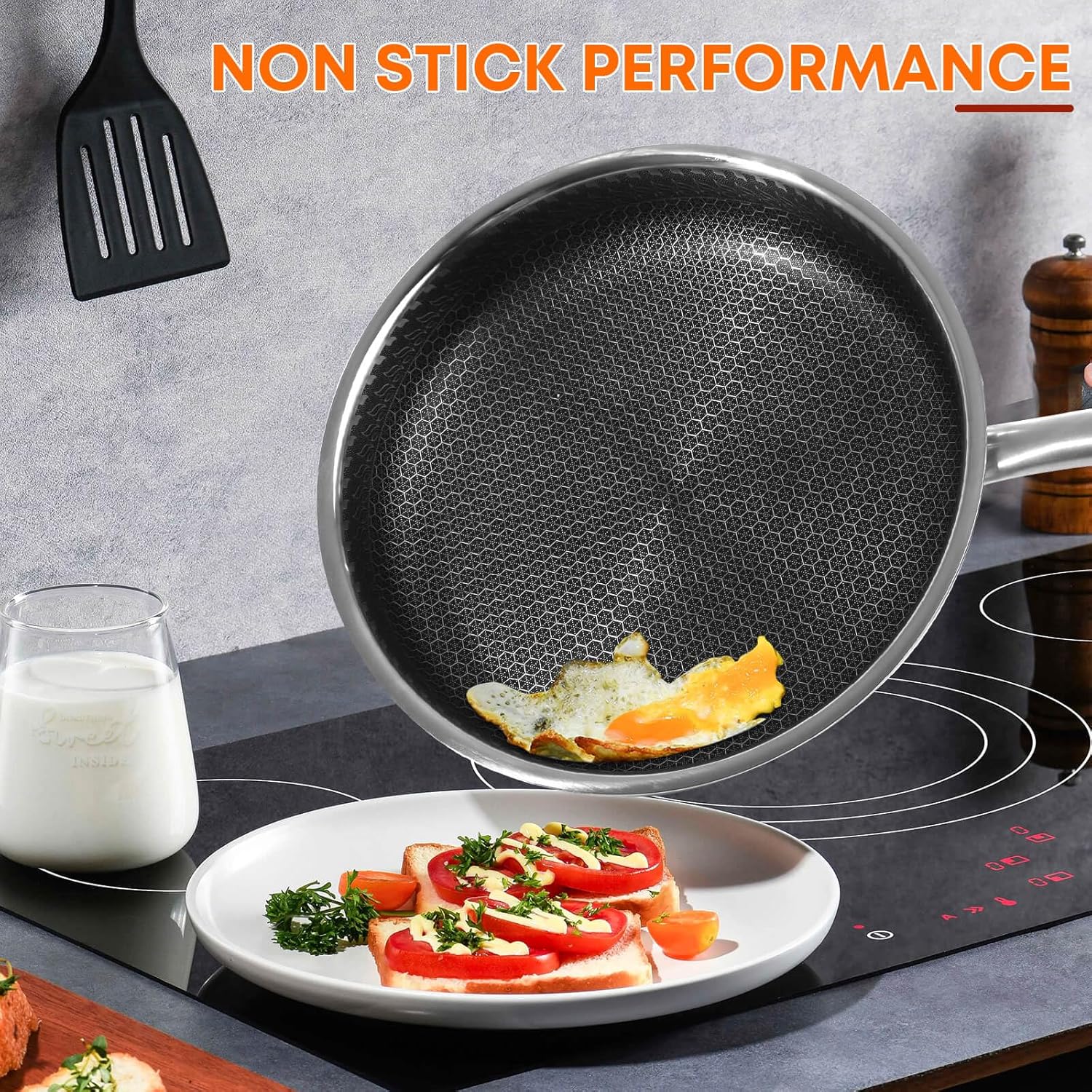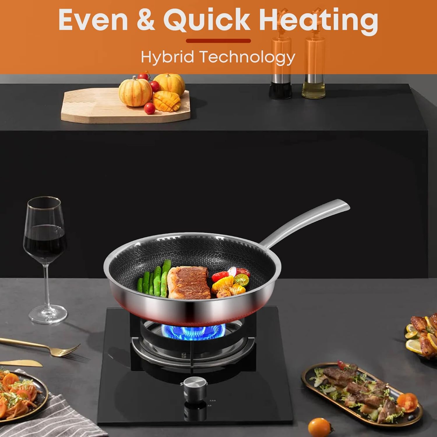 ✅【Tri-Ply Development】Cookware incorporates a tri-ply development of top of the range aluminum between two layers of stainless-steel laser-etched with our patented hexagonal nonstick floor to supply the best hybrid cooking efficiency and warmth distribution.