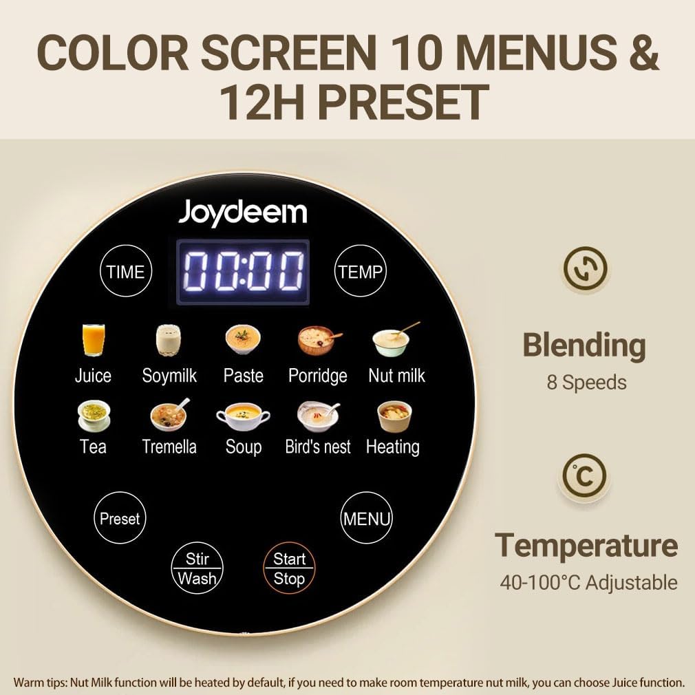 12H PRESET & 10 MENUS – 12 hour preset of joydeem silent blender permits you to get pleasure from scrumptious drinks at any time. JD-J03 cooking blender comes with 10 main menus, so you possibly can simply make soymilk, nut milk, fowl’s nest, porridge, soup, tea, juice, and so on. This quiet blender has 8 adjustable speeds, 40-100℃ optionally available temperature, and it’ll routinely maintain heat on the finish of labor.