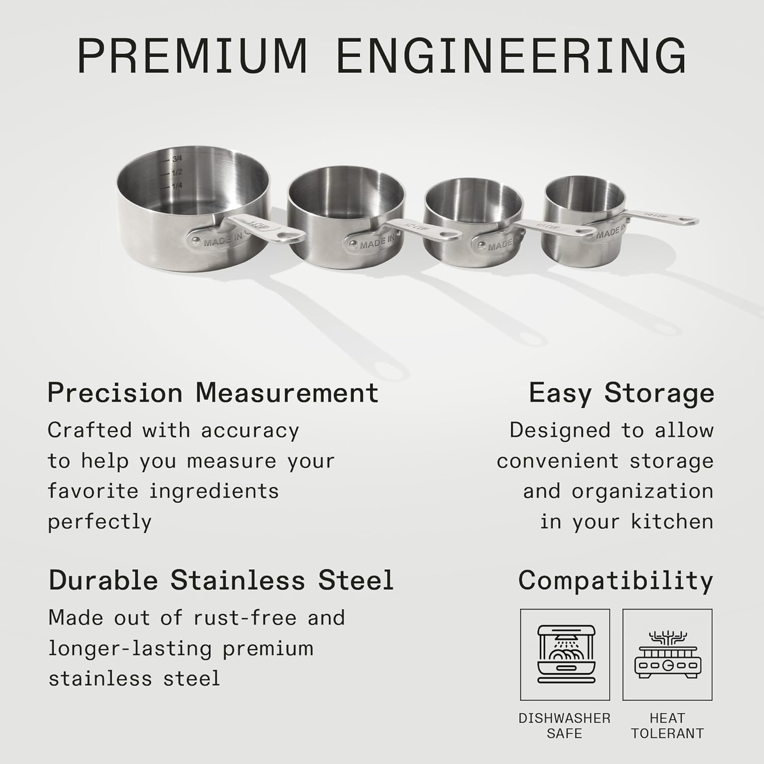 These Measuring Cups are made out of 304 Stainless Metal. They’re meant for each moist and dry components, and are designed to be cohesive to our Stainless Clad Assortment, that includes our signature aesthetic and deal with design. They’re simply stackable and may safely be saved in a family drawer or cupboard. The 1 Cup is laser etched with ¼, ½, and ¾ marks that don’t (and gained’t) scrub off. Every deal with is engraved with its personal measurement marking, and every cup is steady when empty and when stuffed. Made in China.