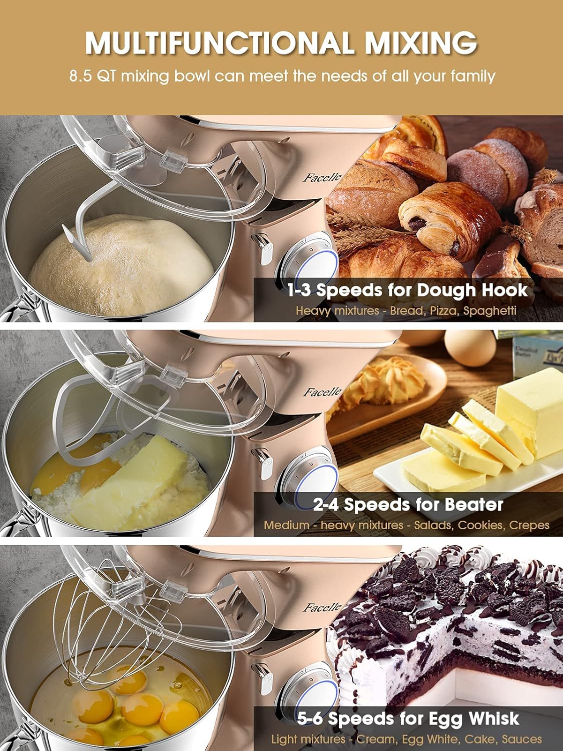 With this mixer, you will save extra time on a lot of your present favourite recipes and presumably strive extra new meals you have by no means made earlier than, create what you wish to create, and share the enjoyment and satisfaction of baking with your loved ones and pals, the Facelle stand mixer makes each baking second good.