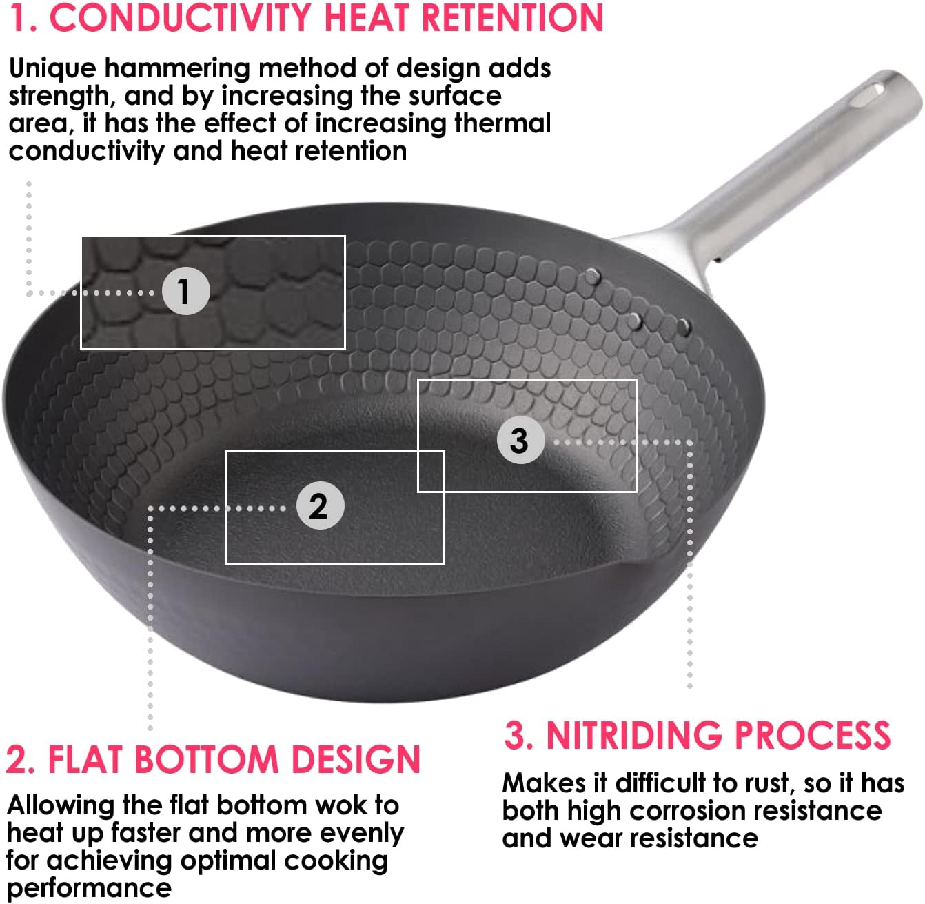 🍳《EXCELLENT MATERIAL AND EVEN HEATING》 This 11″(28cm) wok pan is created from heavy-duty iron. The uneven fibrous texture on the underside of the pan with totally different heights reduces the realm of contact with the substances, stopping sticking and scorching that happen in iron frying pans. This wok can be utilized on fuel, electrical, radiant and electromagnetic stoves. Because the backside is flat, it may be used not just for frying but in addition for varied dishes corresponding to steak and egg dishes.